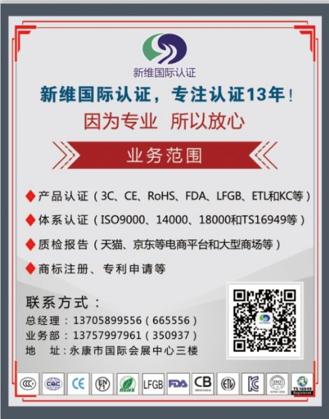 新維國(guó)際認(rèn)證位于浙江永康市會(huì)展中心六樓,經(jīng)歷十五年風(fēng)風(fēng)雨雨,匯集成本地產(chǎn)品認(rèn)證、體系認(rèn)證和企業(yè)管理咨詢培訓(xùn)較大和較有實(shí)力的公司之一,業(yè)務(wù)范圍已經(jīng)擴(kuò)展到全省,甚至到全國(guó);公司擁有非常專業(yè)的認(rèn)證專員、有實(shí)戰(zhàn)經(jīng)驗(yàn)和專業(yè)的管理培訓(xùn)教練,公司擁有自己的檢測(cè)設(shè)備,方便產(chǎn)品預(yù)檢測(cè)。我們與德國(guó)TUV、瑞士SGS、英國(guó)ITS、法國(guó)BV、美國(guó)UL、中國(guó)質(zhì)量認(rèn)證中心、中國(guó)中檢集團(tuán)、中國(guó)家用電器研究院、國(guó)家玩具檢測(cè)中心、浙江立德、浙江方圓、北京中聯(lián)天潤(rùn)和北京凱新等機(jī)構(gòu)建立了親密的合作伙伴關(guān)系。